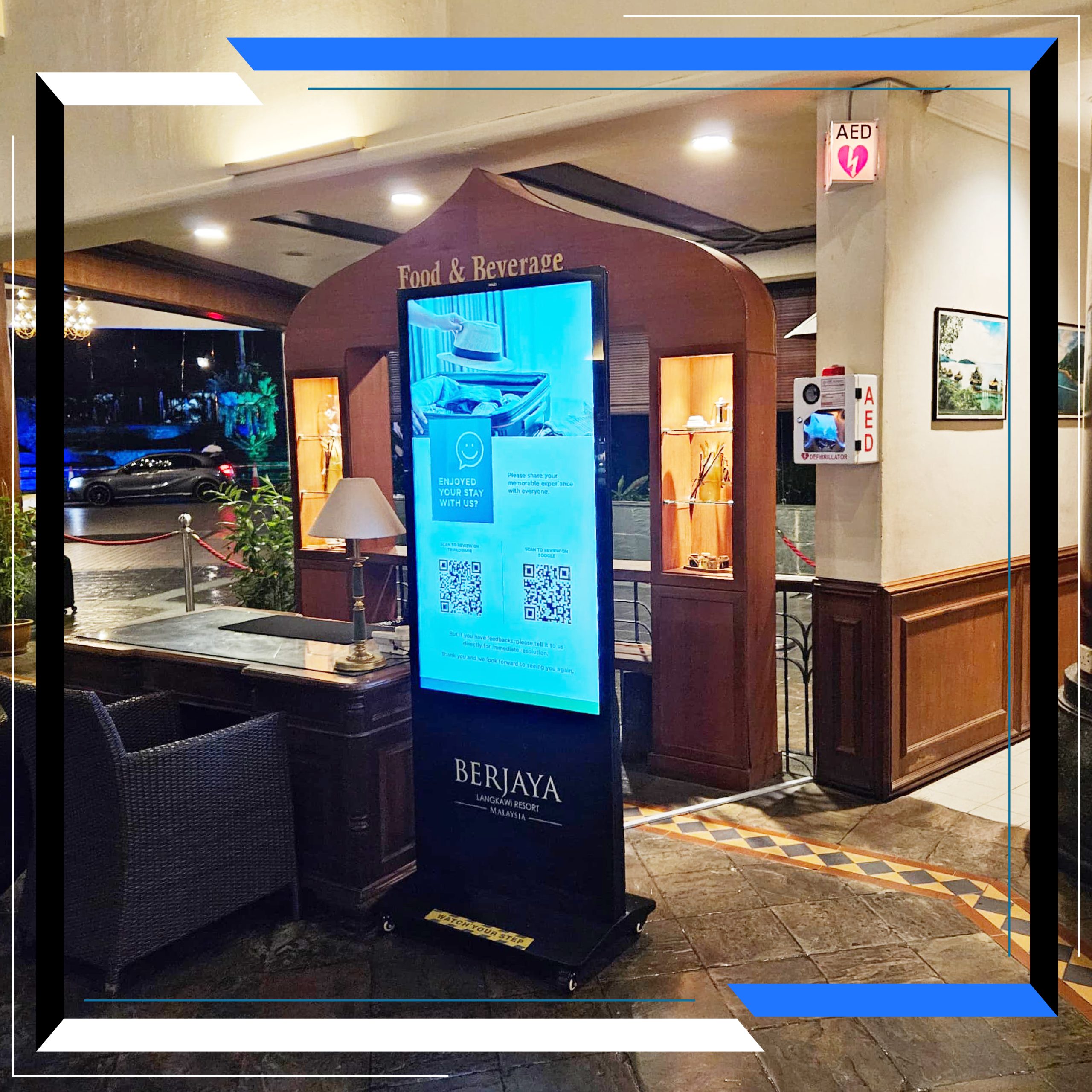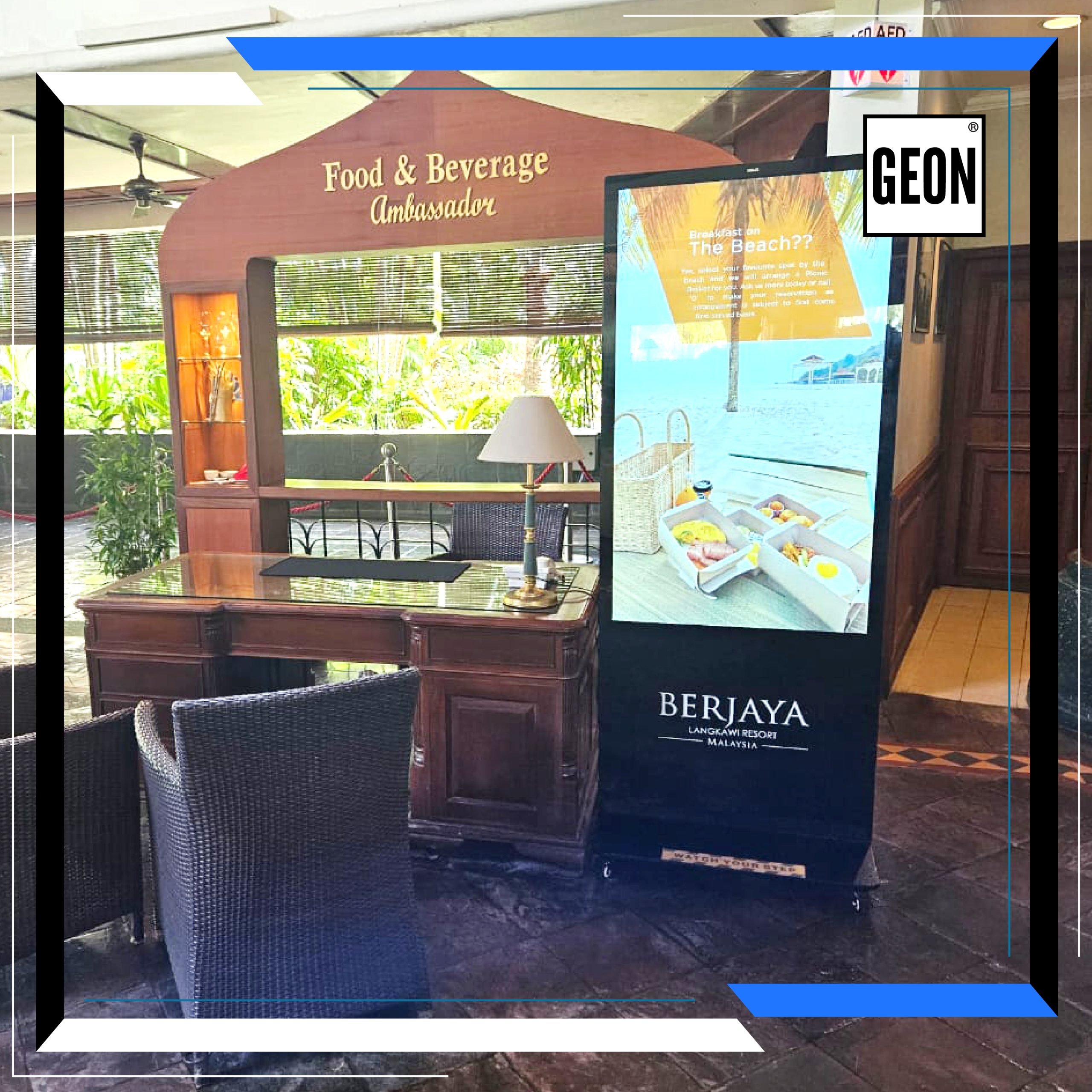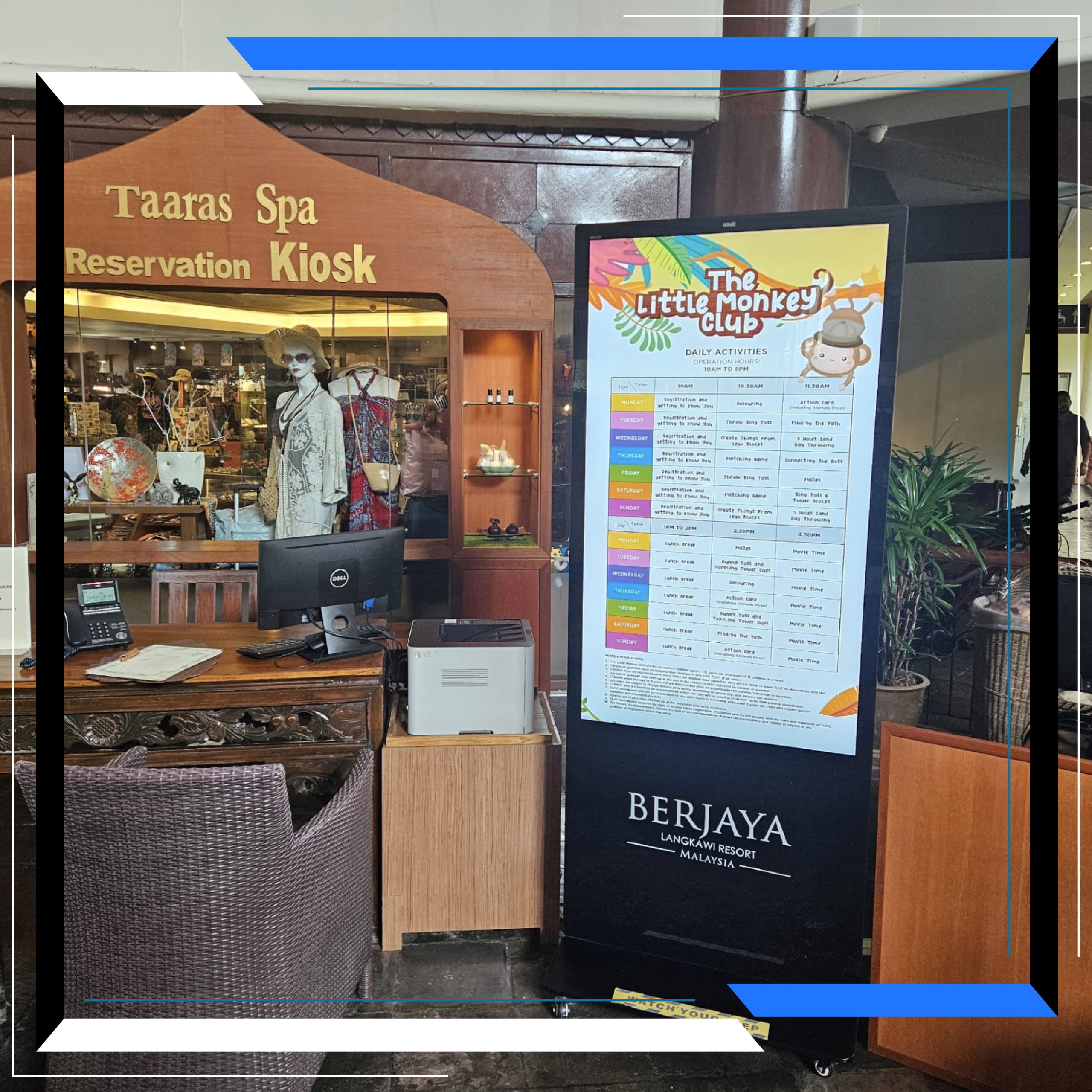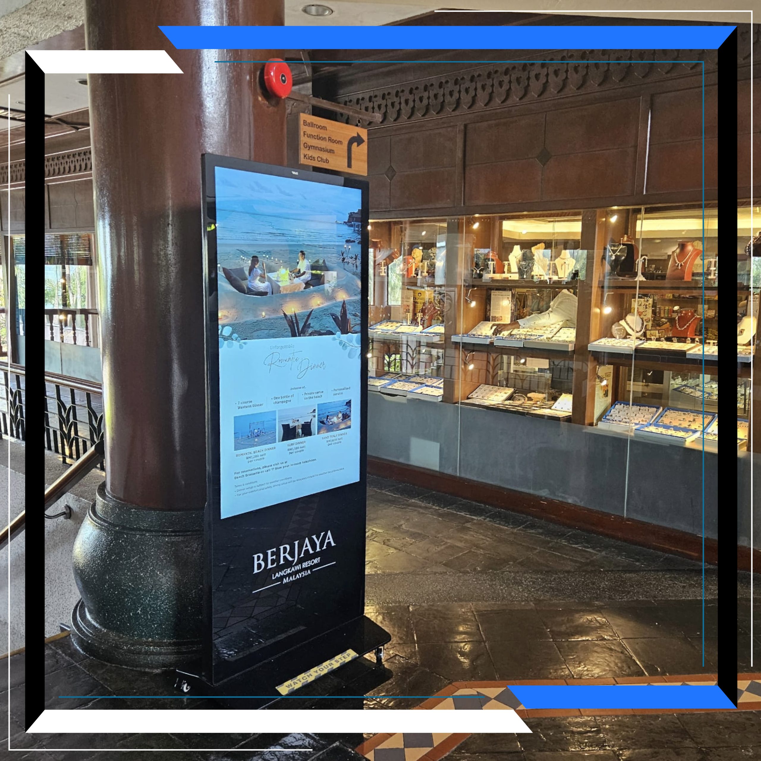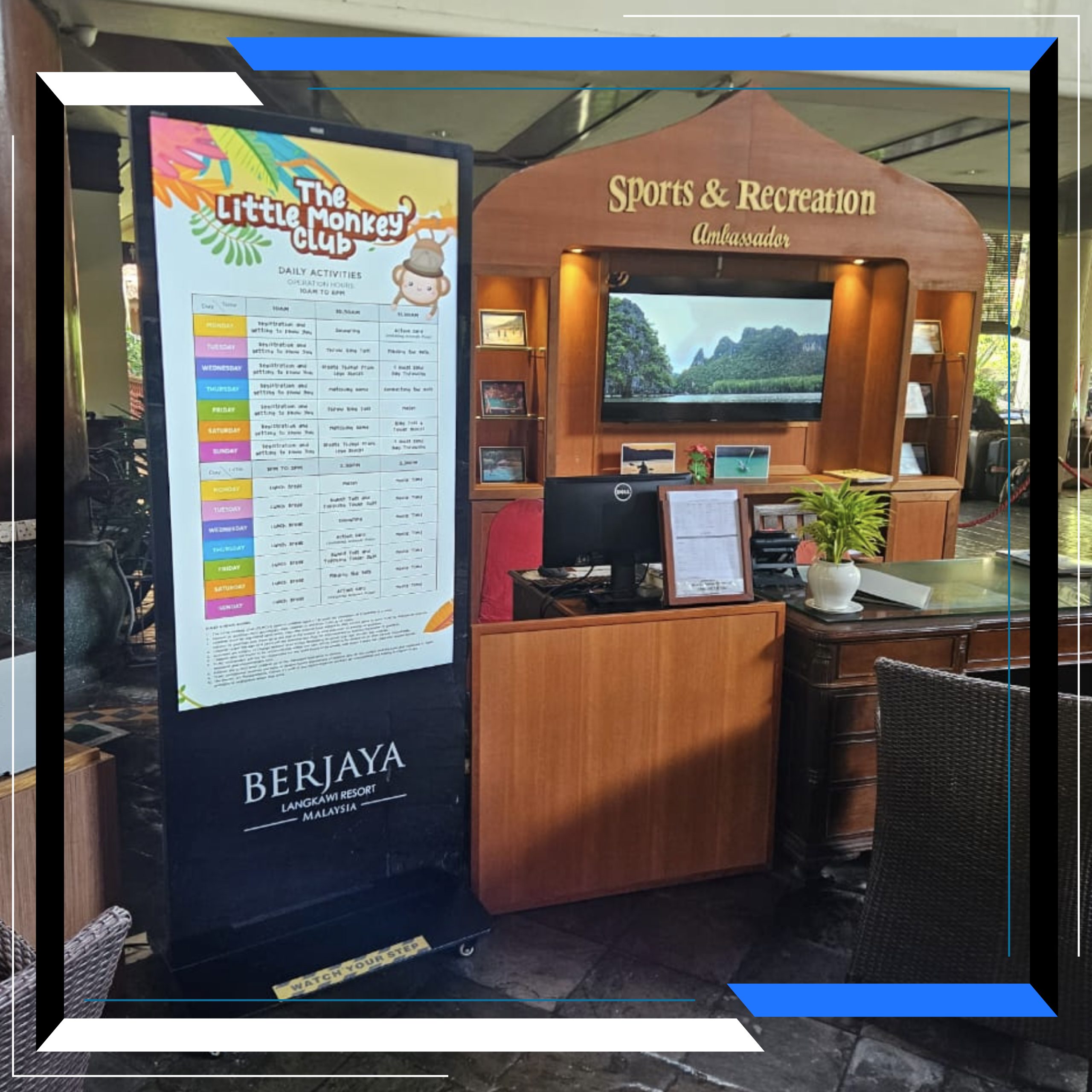 Location : Langkawi, Malaysia. Project : Supply, install, and configure Driger GA55FHD03CS 55” Freestanding Digital Standee at Berjaya Langkawi Beach Resort to display promotional offers, resort activities, and guest information.